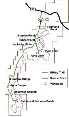 Bryce Canyon is not really a canyon, but rather a series of amphitheaters carved by erosion from the edge of the Pausaugunt Plateau. The park's main scenic drive runs atop the plateau connecting various lookouts over the amphitheaters. Hiking trails run along the rim and down into the amphitheaters.